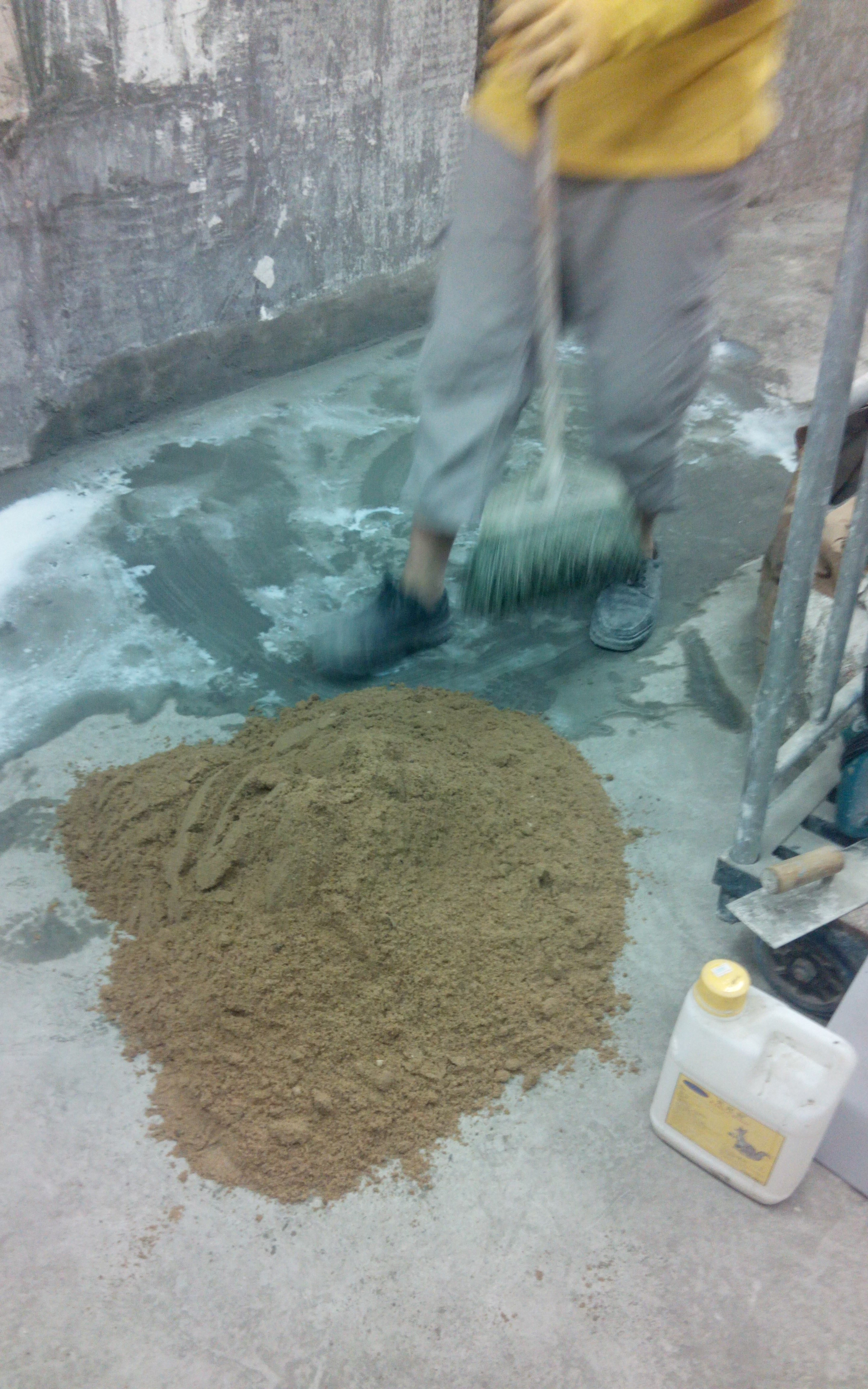 在鋪廚房及浴室地台磚時,要早兩天做防漏,免致他日浴室漏水時滲落下層,做法是塗英泥寶水劑,掃乾淨地台,以一份英泥寶開三份水的份量開成水劑,用雞脾掃塗於地台上,也在牆壁塗半呎高,待半天乾後在牆角交接位做英泥沙三角嘜(1吋寬),第二天乾後再塗多次英泥寶水劑,再隔一天(第三天)再開英泥寶水劑弄濕地台才鋪英泥沙砌地磚。