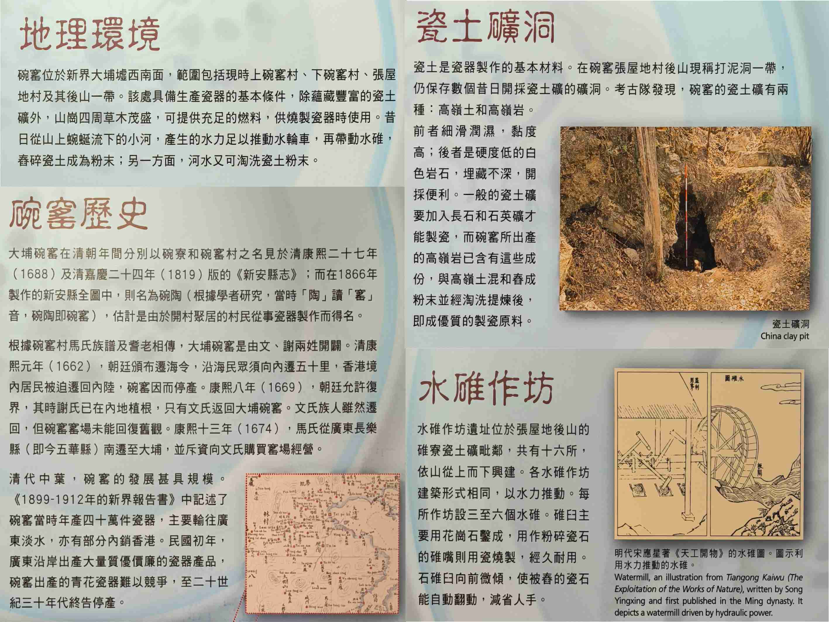 大埔碗窰曾是新界的陶瓷工業中心,早在明代文、謝兩族已經營窰場,生產青花瓷器。清朝康熙十三年(一六七四年)從廣東長樂縣南遷至大埔的客籍馬氏族人,向文氏出資購入窰場。二十世紀初期,由於廣東沿海其他窰場的廉價產品競爭,碗窰的陶瓷業日趨式微,至一九三二年終告停產。碗窰的考古調查,發現從採礦到入窰裝燒各項工序的遺蹟,包括礦坑、水碓作坊、碾磨作坊、淘洗池及龍窰等,均是香港重要的文化遺產。