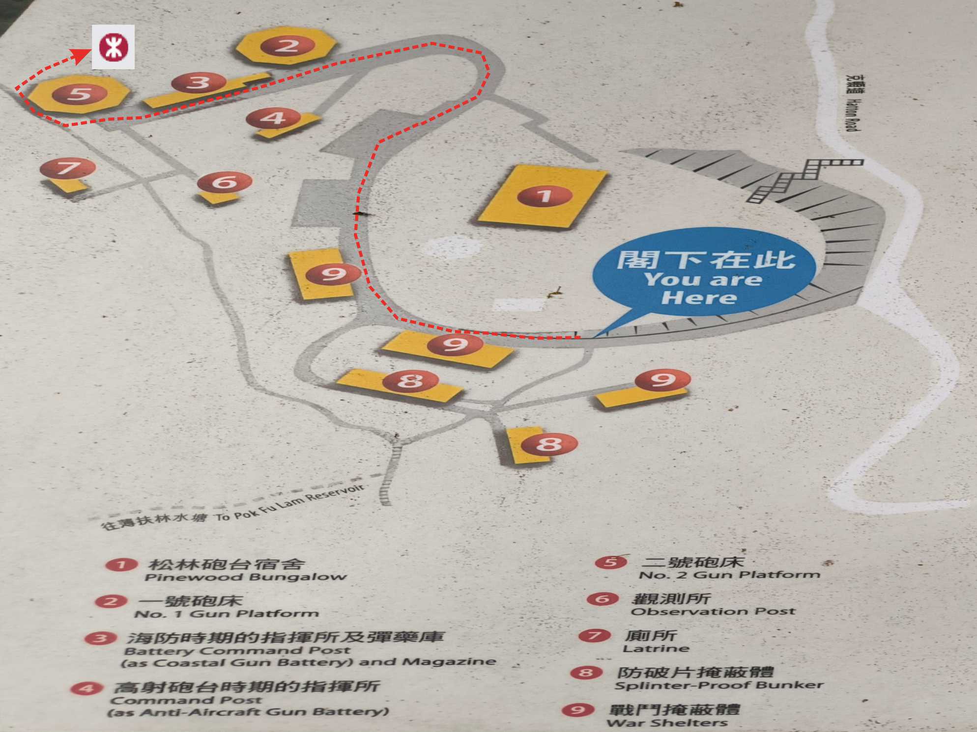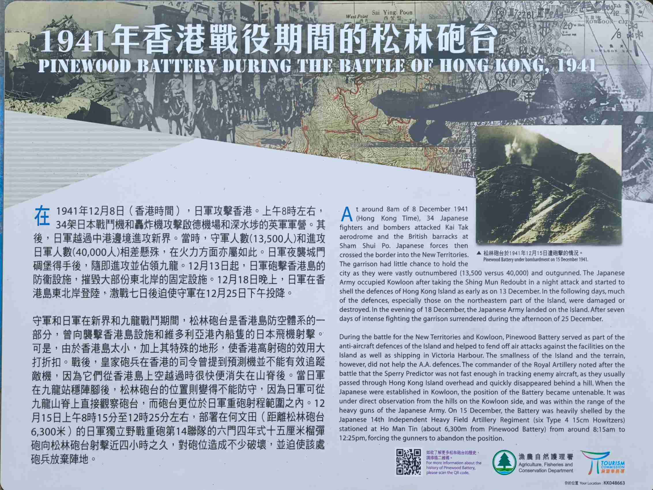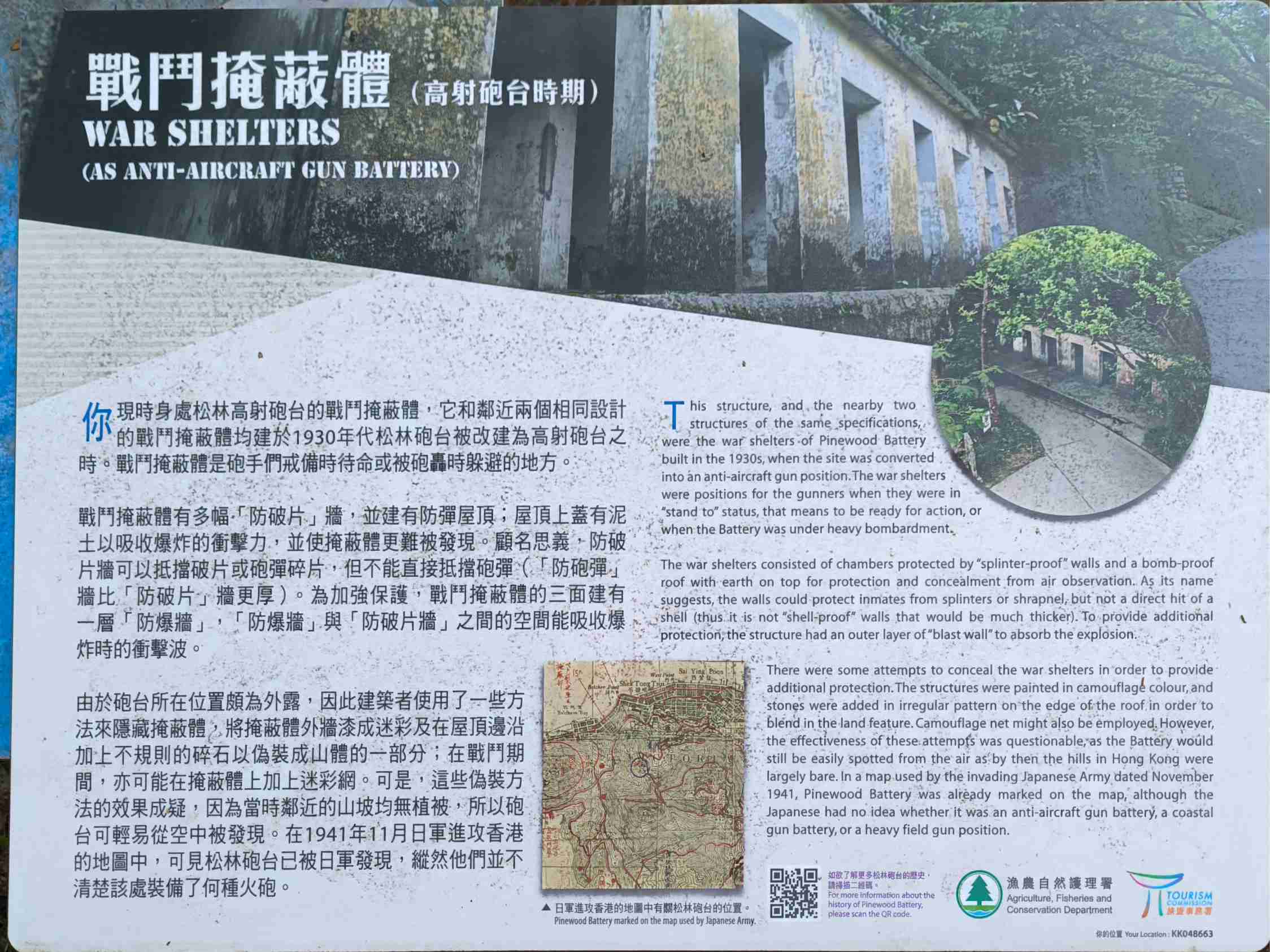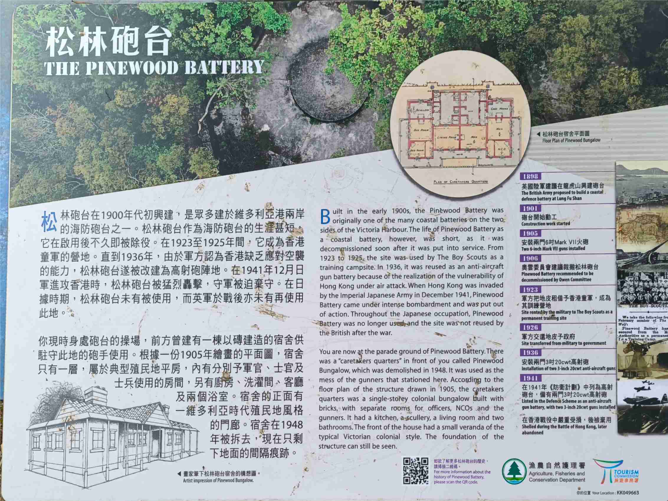 松林砲台建於19世紀末至20世紀初,屬於英軍在港島山頂防禦系統的一部分,用以防禦可能由海上或維港方向的威脅。雖已廢棄,但遺址仍保留戰爭痕跡,石牆、基座等結構依稀可見,成為研究香港軍事史的重要見證。