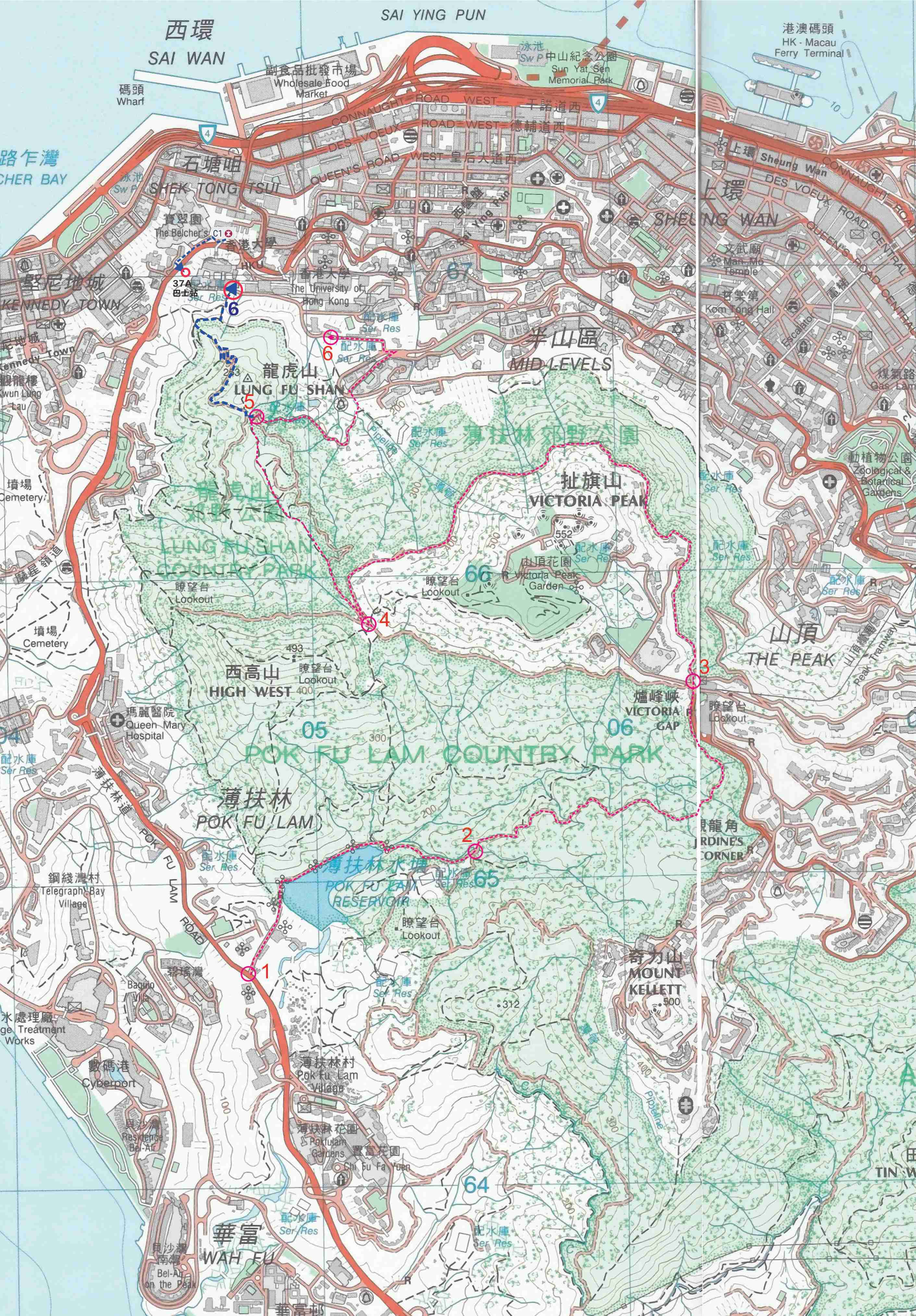 沿薄扶林水塘道逆走爐峰自然步道(爐峰是太平山的別名),在爐峰峽沿盧吉道直入環山道,可俯瞰維港景色。若沿夏力道順走環山道,有壯麗的飛瀑,路盡處為小花園。沿克頓道而下,見山丘松林廢堡,逾百年的松林炮台,戰爭的痕跡至今猶在。港島徑是尋界石、訪學府,以及研究港島歷史地理及自然景物的好地方。 |