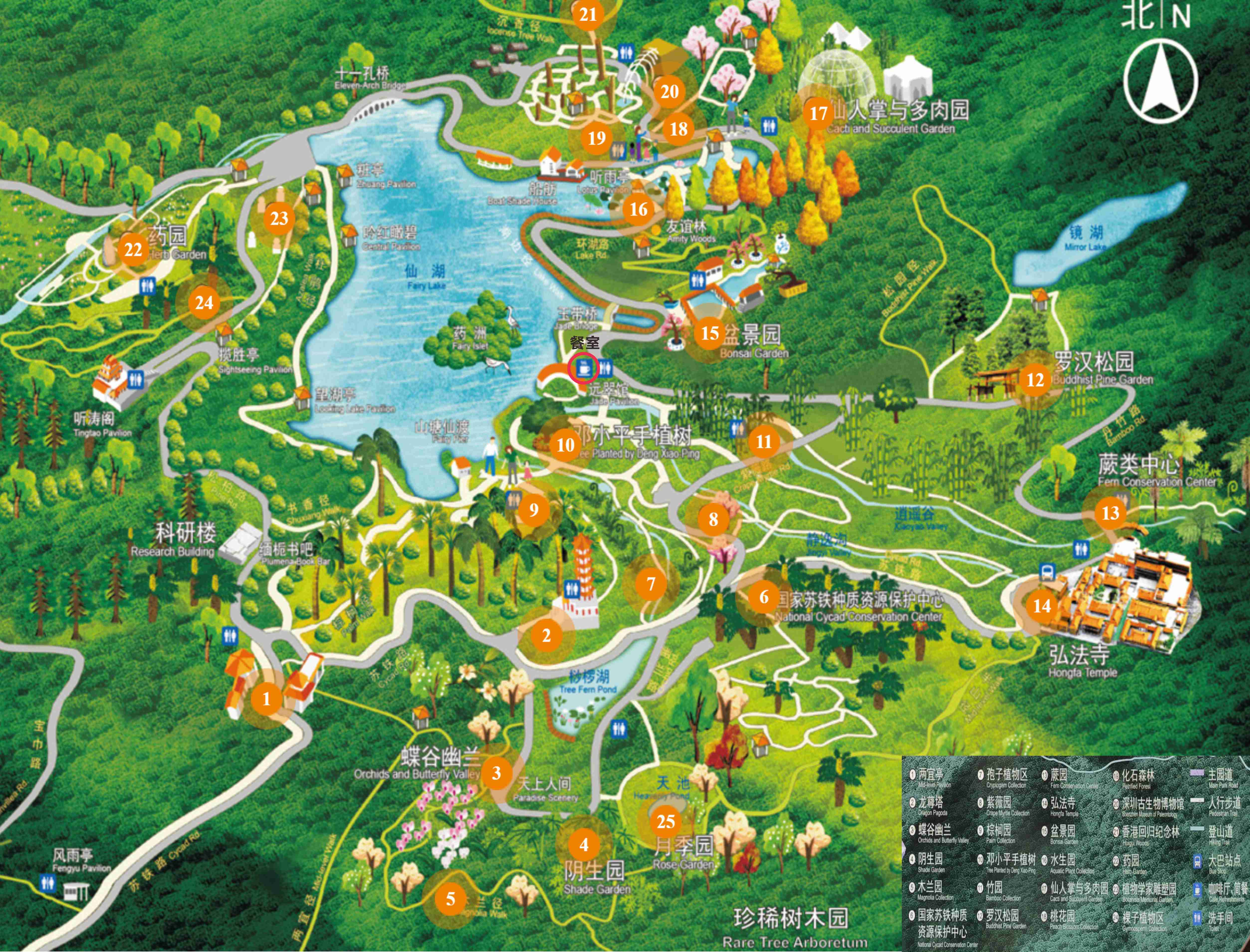 仙湖植物園是以旅遊為主,科研科普為輔的風景植物園。現園內共建有17個植物專類區,收集有8000餘種植物。全園分為門區、天上人間景區、湖區、廟區、化石森林、松柏杜鵑景區等6大景區。建有蘆汀鄉渡、山塘野航、竹葦深處、別有洞天、玉帶橋、十一孔橋、龍尊塔、聽濤閣、兩宜亭、攬勝亭、桃花亭等十幾處園林景點和國家蘇鐵種質資源保護中心、蔭生植物區、蝶谷幽蘭、沙漠植物區、孢子植物區、裸子植物區、藥用植物區、引種區、竹區、珍稀樹木園、盆景園、木蘭園、棕櫚園、百果園、水景園、桃花園、紫薇園等17個植物專類園。