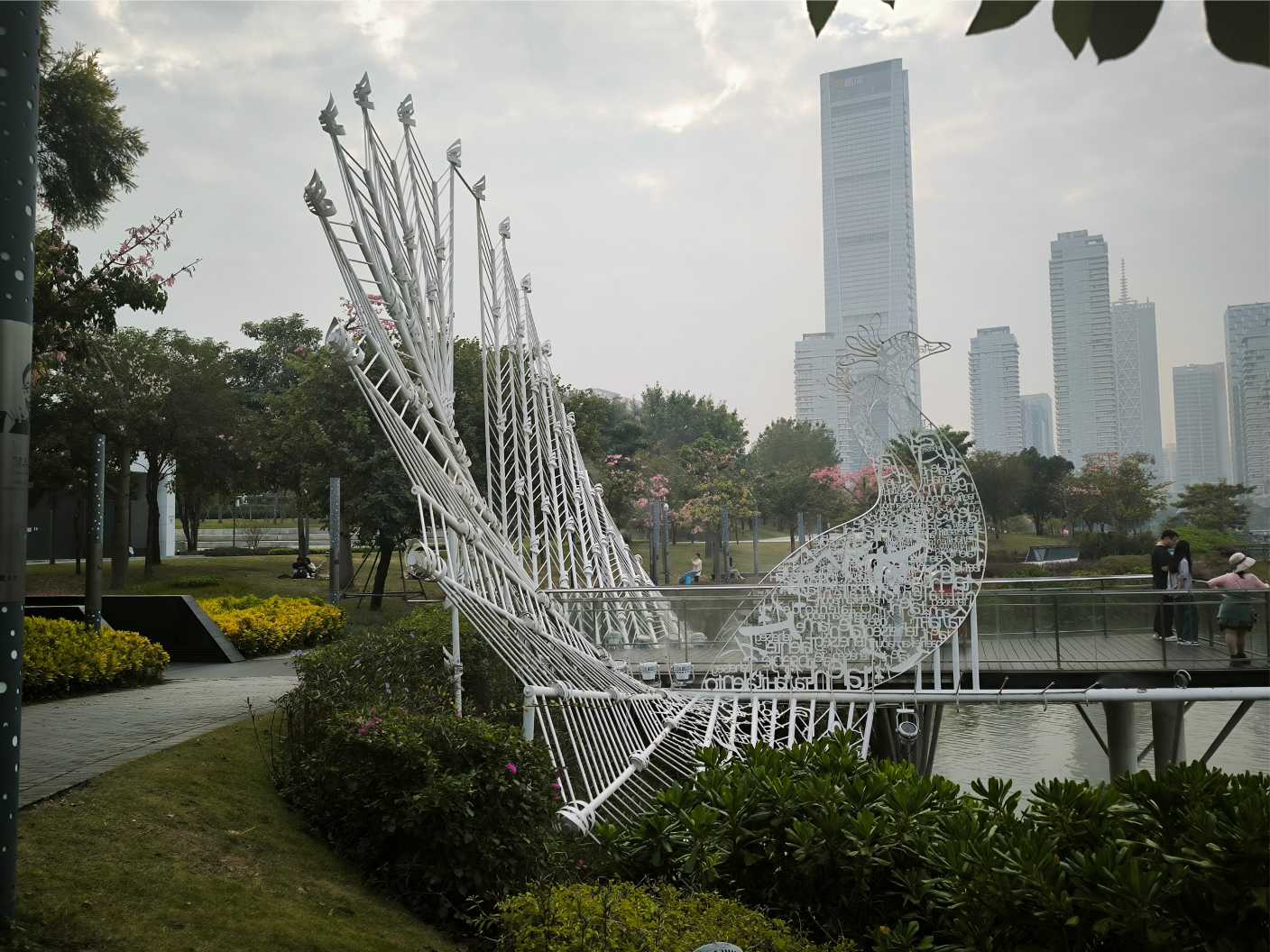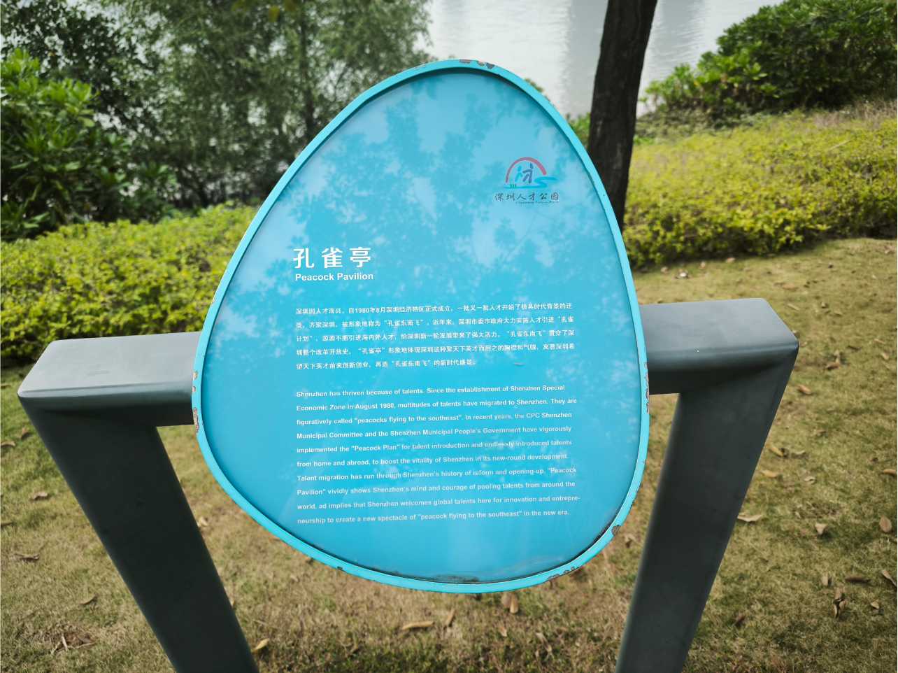 孔雀亭由兩隻乳白色孔雀雕塑組成,展翅欲飛,姿態優雅。開屏的孔雀象徵深圳為人才提供廣闊舞台,鼓勵他們展翅高飛。