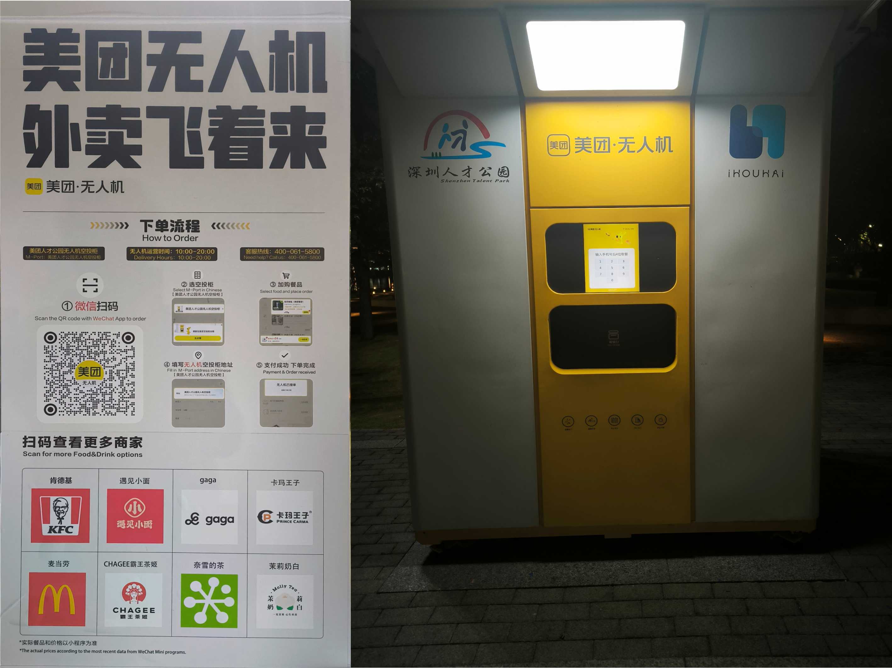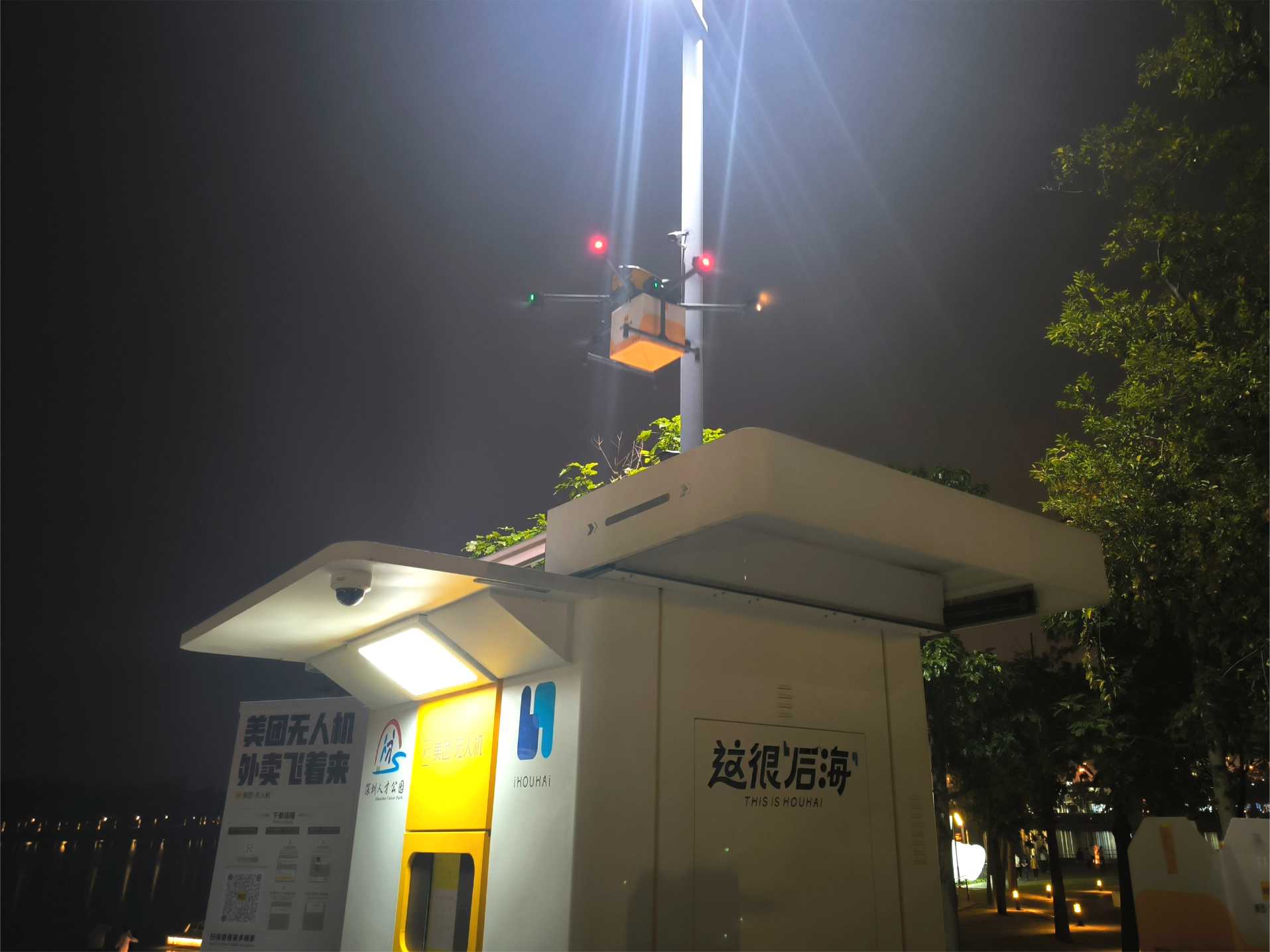 美團無人機送餐站是「低空經濟」的創新應用,遊客在公園內下單後,無人機能在幾分鐘內將餐點空投至指定取餐櫃,解決了傳統外賣員在公園定位困難、配送慢的問題。航線起點位於海岸城商圈,配送範圍約 1 公里,幾分鐘即可送達人才公園。定位優勢:過去公園取餐常需用「第幾棵樹」「第幾盞路燈」定位,無人機配送後只需到空投櫃取餐,效率提升近 50%。