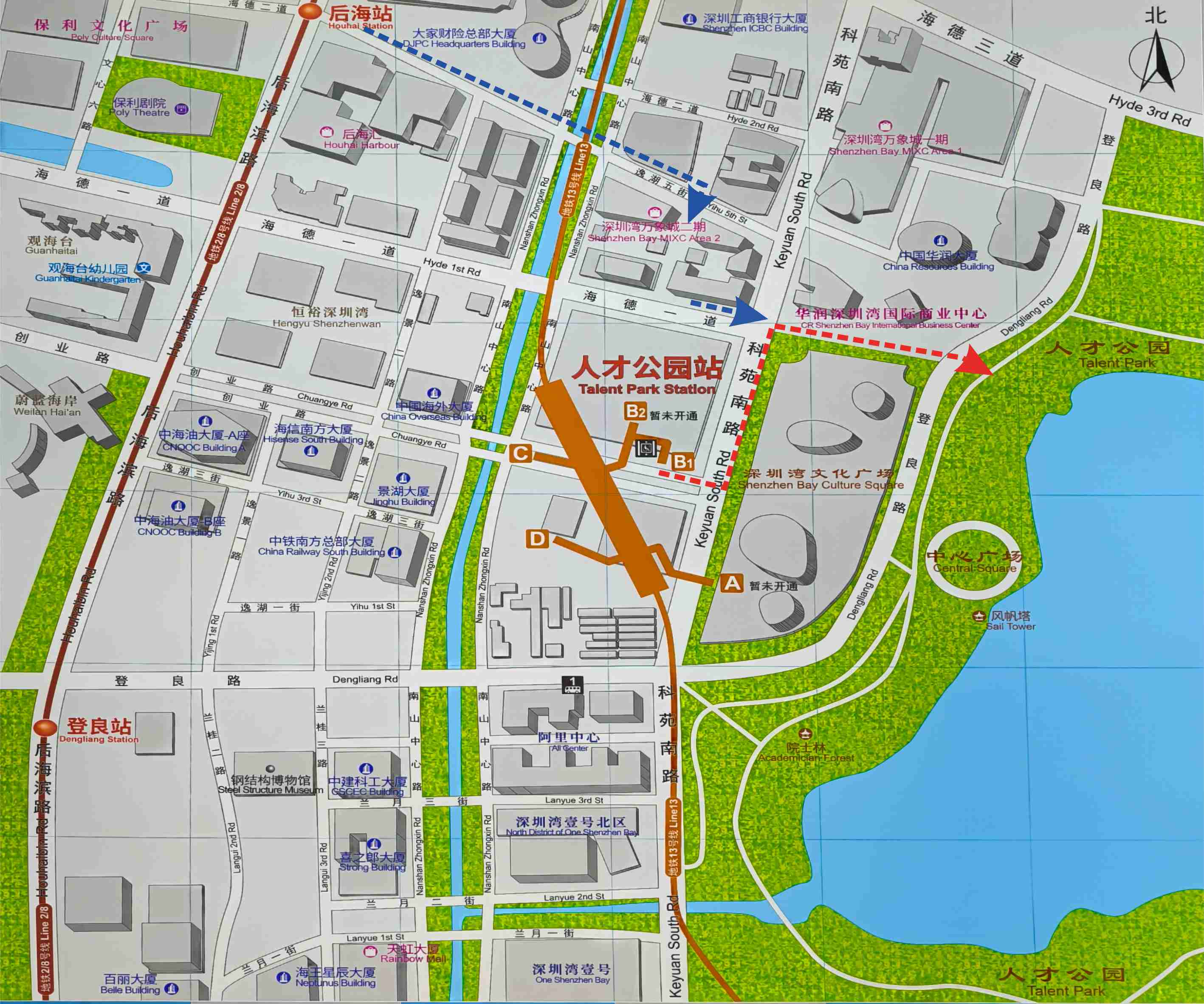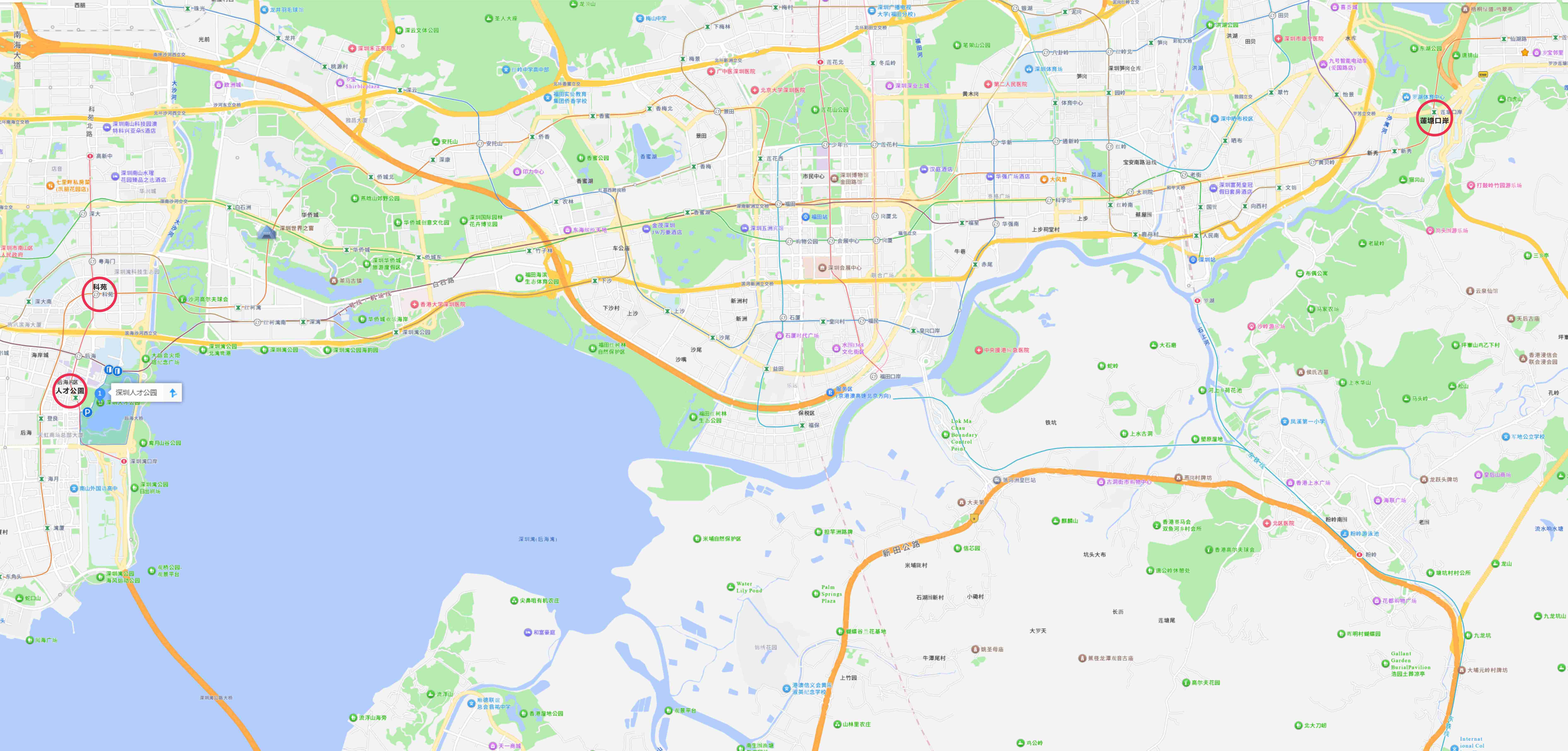在蓮塘口岸地鐵站乘2號線,在20站後在科苑轉13號線,2站後人才公園下車。另一選擇是在2號線的后海站下車, 取K2出口歩往萬象城午膳, 這樣便無需轉13號線了。交通需時約個半鐘。