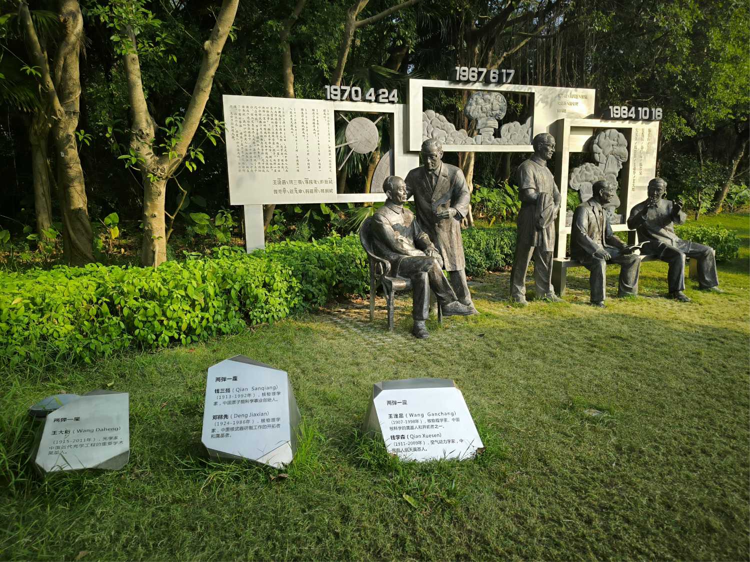 百傑山的人物雕塑匯集了 愛因斯坦、牛頓、蔡倫、鄧稼先、瓦特、愛迪生、達芬奇、門捷列夫、諾貝爾等古今中外的科學家、發明家與文化名人。群雕設計:雕塑分布於山坡與廣場,部分以青銅材質製作,莊重典雅。牆面刻有重要歷史時間,如 1964年10月16日(中國第一顆原子彈)、1967年6月17日(第一顆氫彈)、1970年4月24日(第一顆人造衛星),彰顯中國科技人才的重大成就。