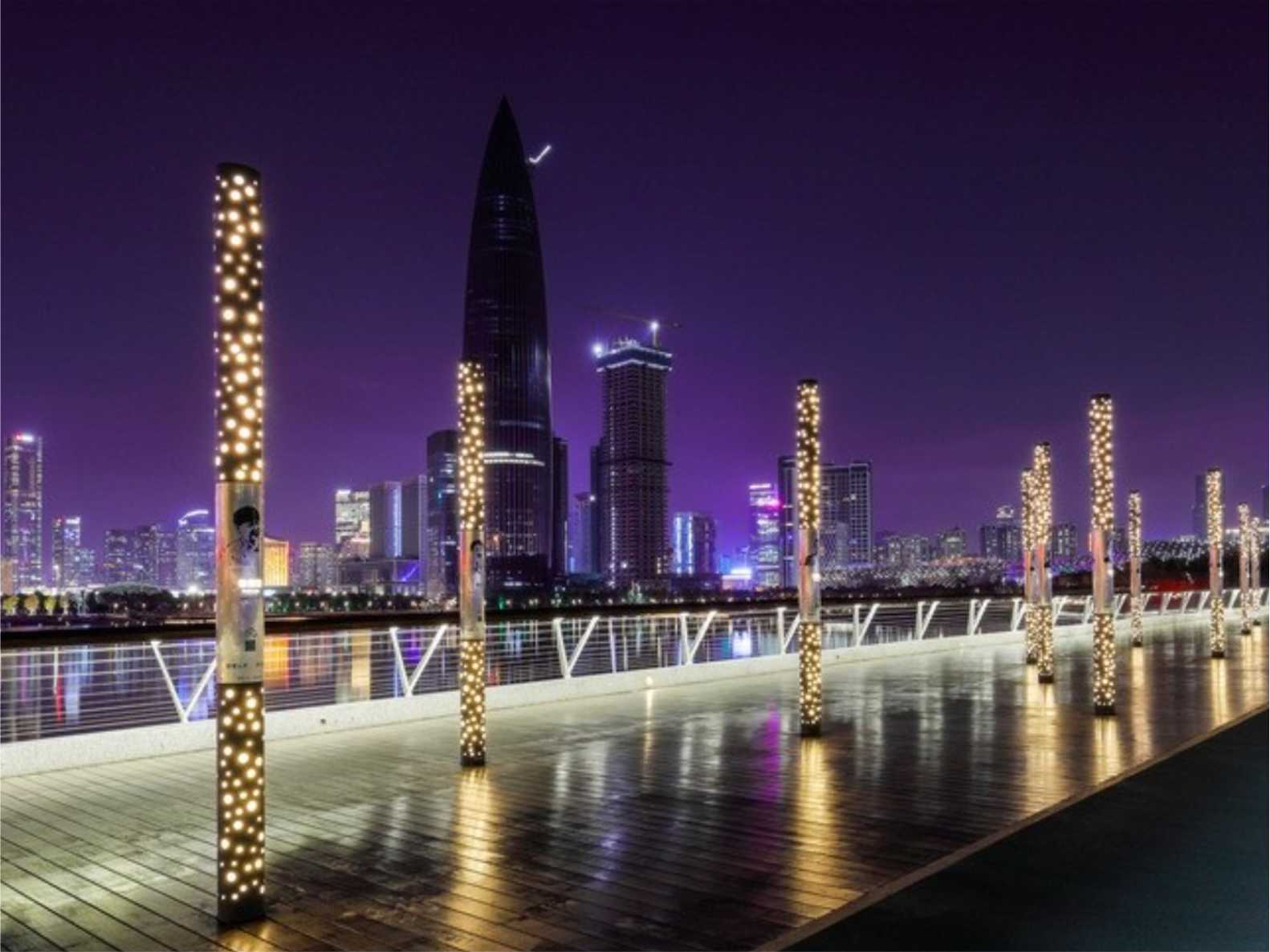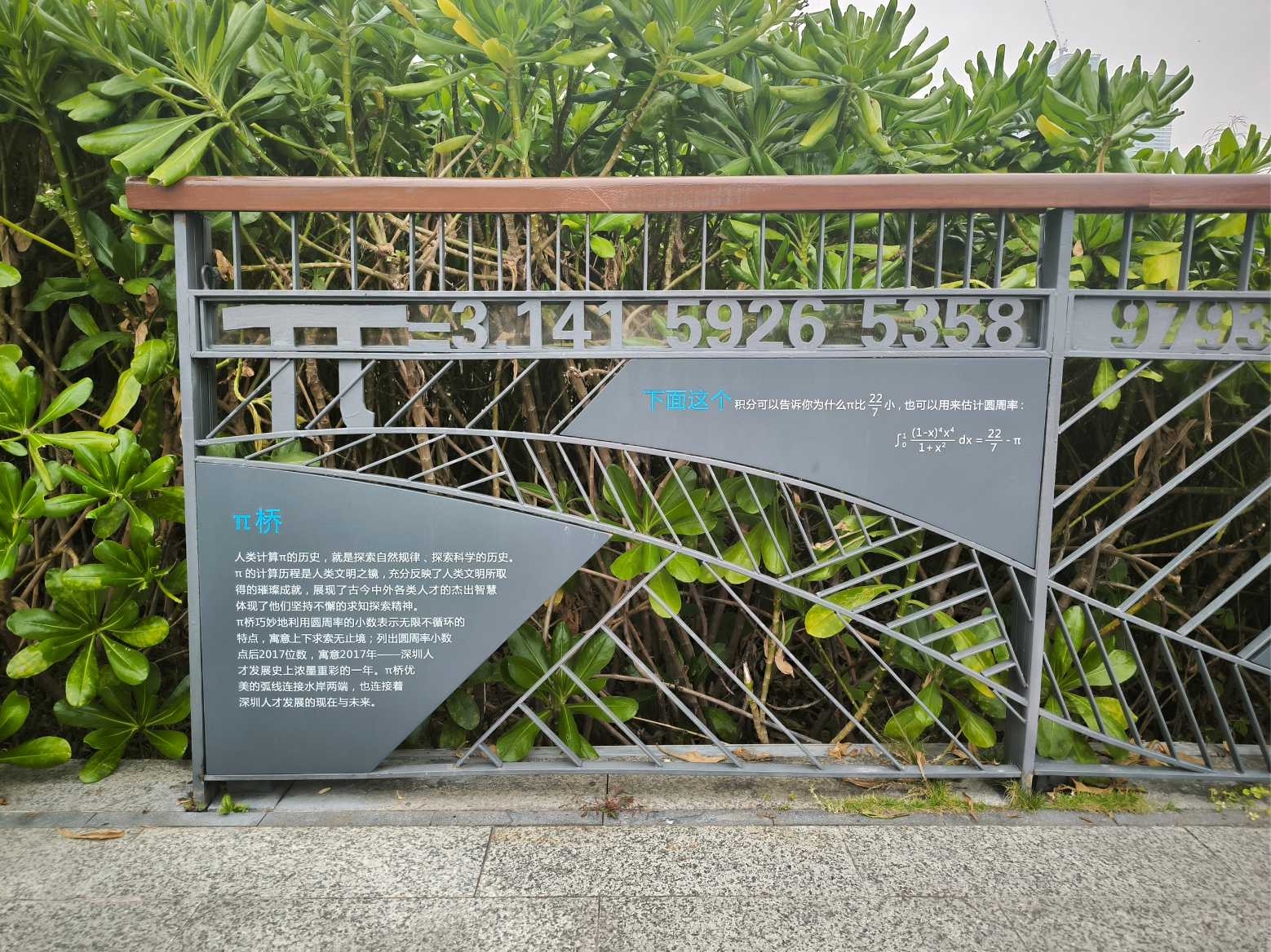π橋以數學符號「π」為設計靈感,寓意數學與科學精神,彰顯深圳尊重人才、推崇創新的城市文化。π 是無限不循環小數,象徵探索未知、追求無限可能,呼應深圳的科技創新城市定位。橋面線條流暢,結合現代建築美學與功能性,既是交通通道,也是藝術裝置。