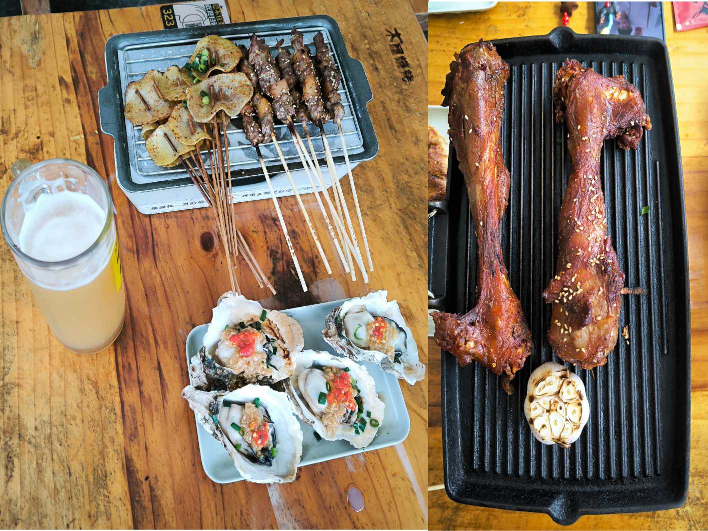 烤羊肉串、土豆片、生蠔及羊棒骨 |