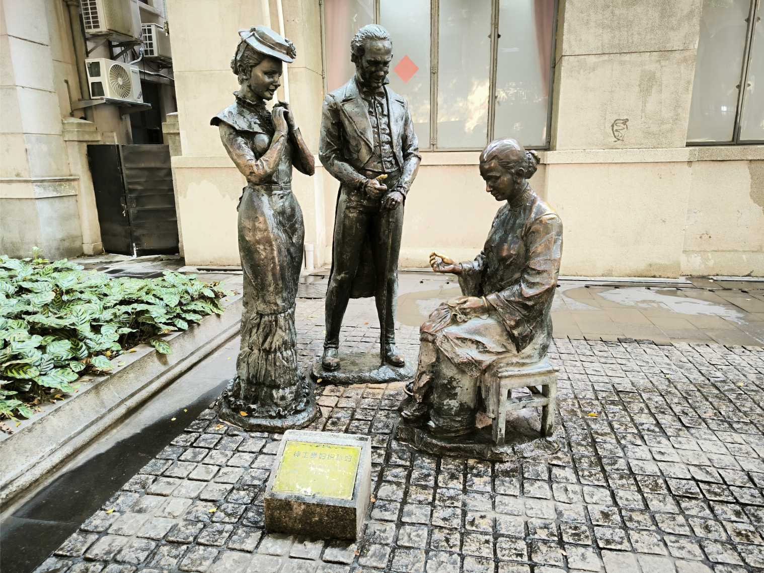 雕像: 外國紳士淑女觀看織補婦手藝 |