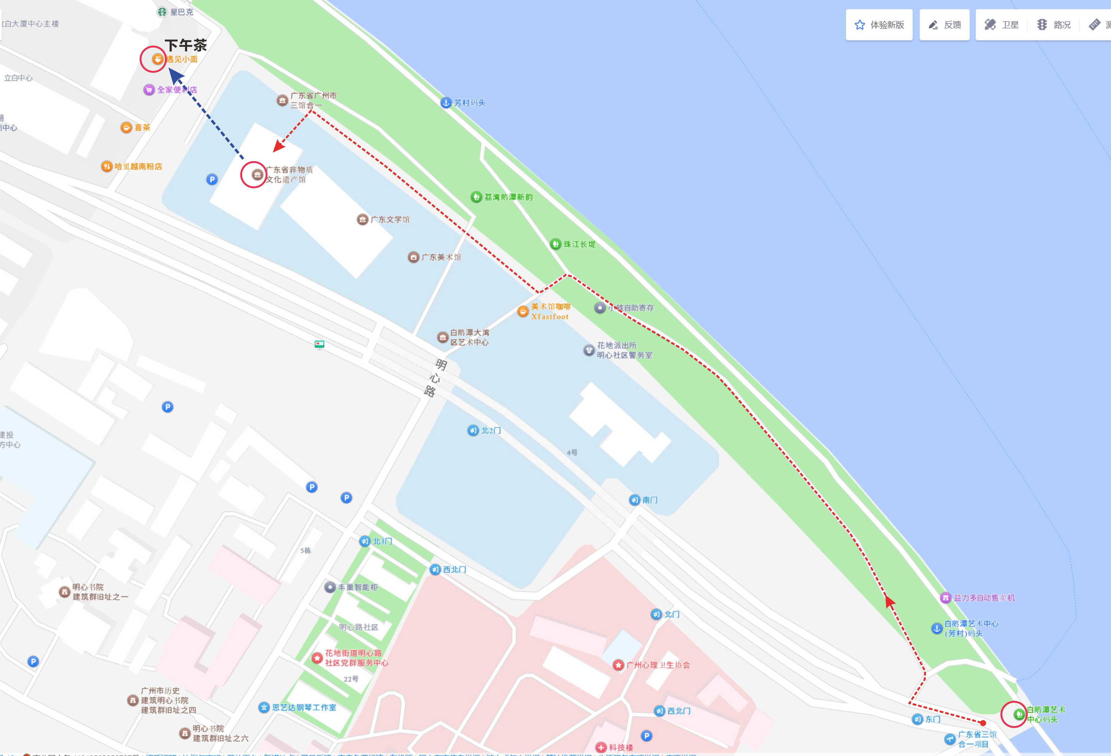 在陶陶居晚飯後步回勝利賓館, 地圖上的藍色虛線, 約15分鐘。 第一天旅程完結。