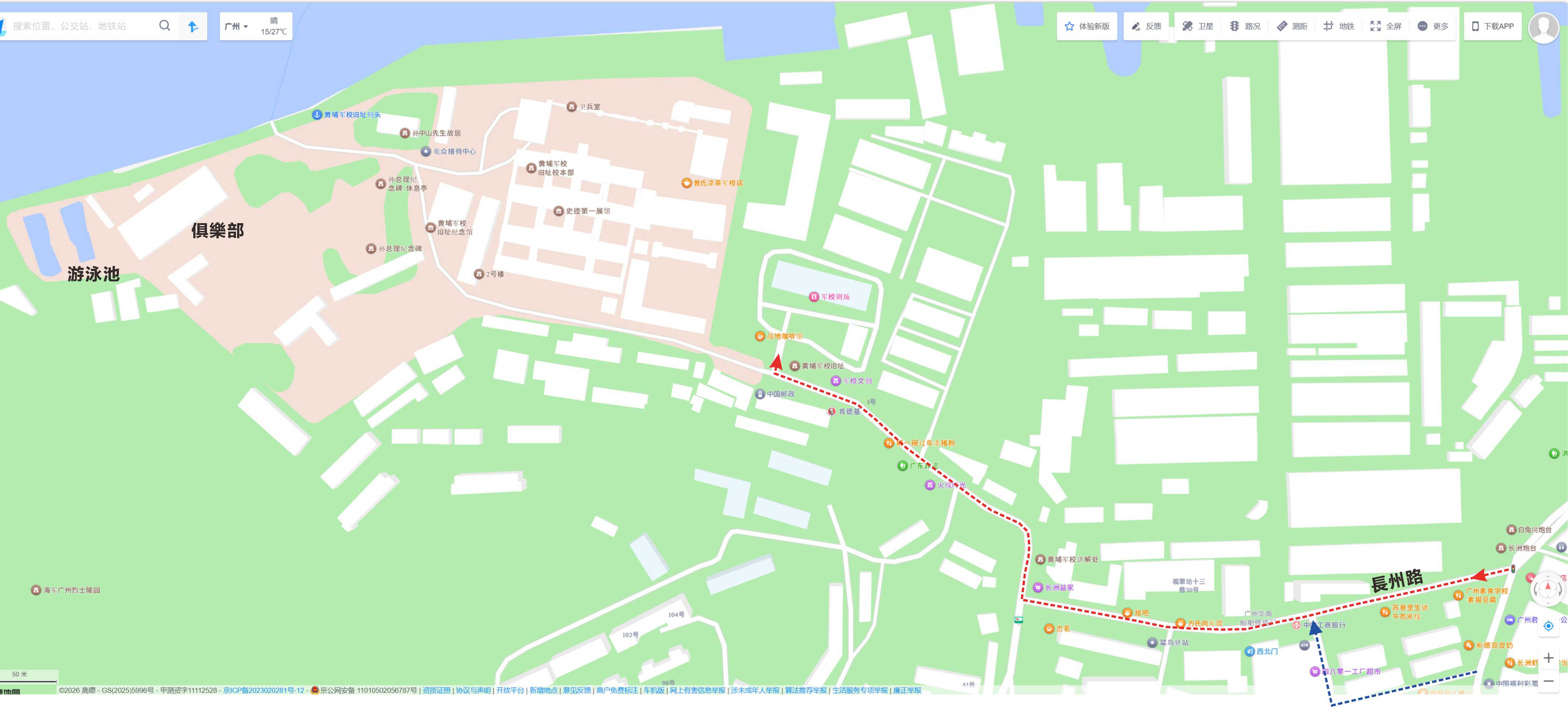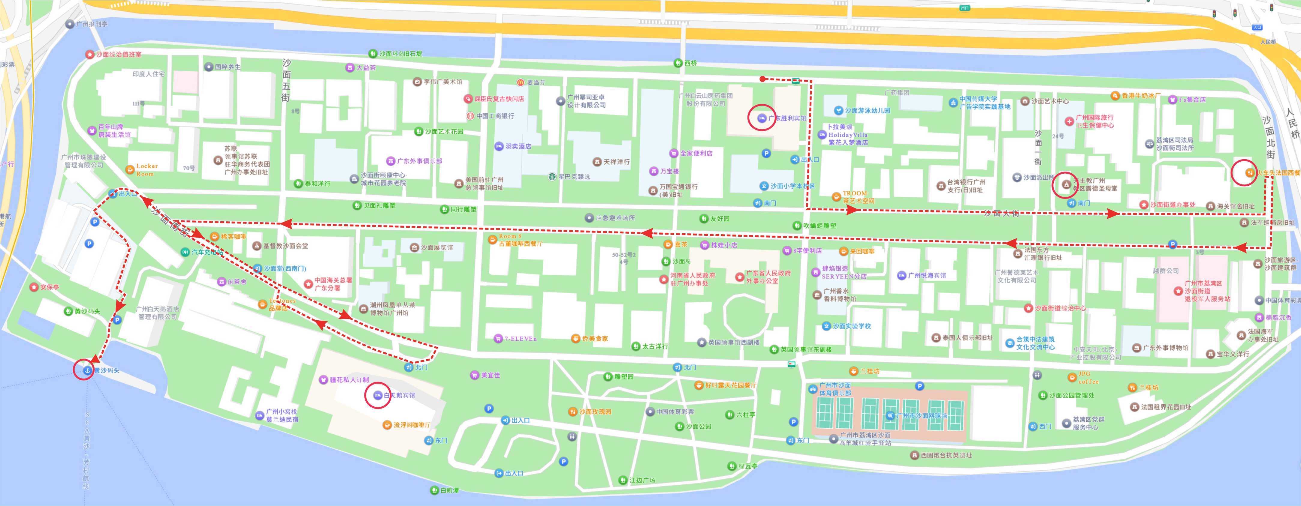 從黃埔軍校打車到沙面勝利賓館(住宿一晚)大約 30 公里, 45 分鐘,費用在人民幣 80–100 元之間。先往勝利賓館取房(請網上預訂)及稍事休息, 再落樓依下面地圖的紅色虛線遊覽沙面。