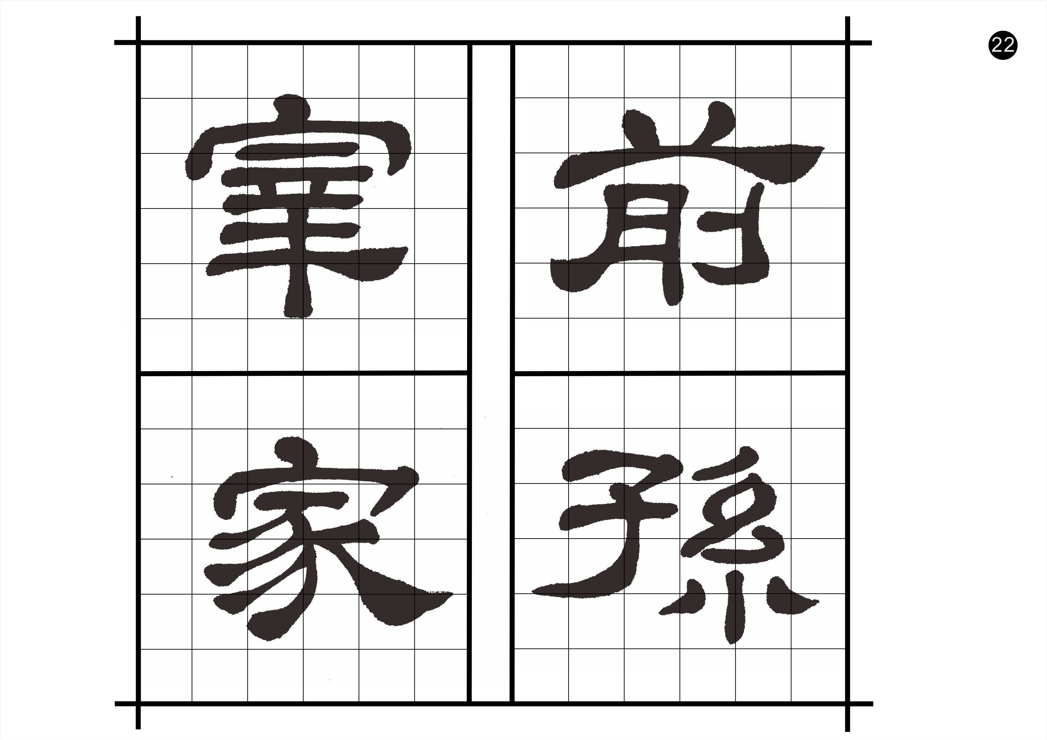 斜角容易出現在筆畫兩端,尤其是橫畫、豎畫的兩端,及撇畫、提畫的落筆處,出現頻率最高。用筆務必藏鋒逆入和回鋒收筆,不要把楷書或行書側鋒入筆的習慣帶進隸書,斜角的毛病可迎刃而解。 - 斜肩