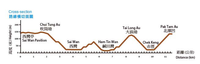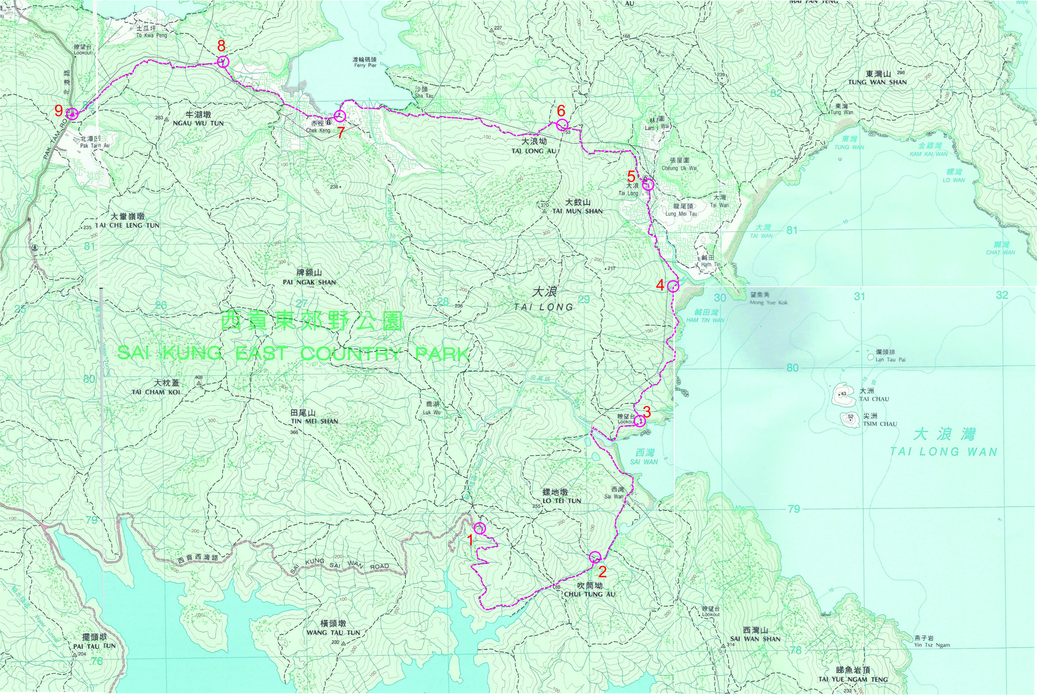 由西灣亭出發至吹筒坳,下行至西灣及鹹田灣,可親身體驗水清沙幼的海灣景色。續登大浪坳,經赤徑往北潭凹。路程頗長,沿途有上下坡段,風景極優美,中途並無其他路徑離開。 |