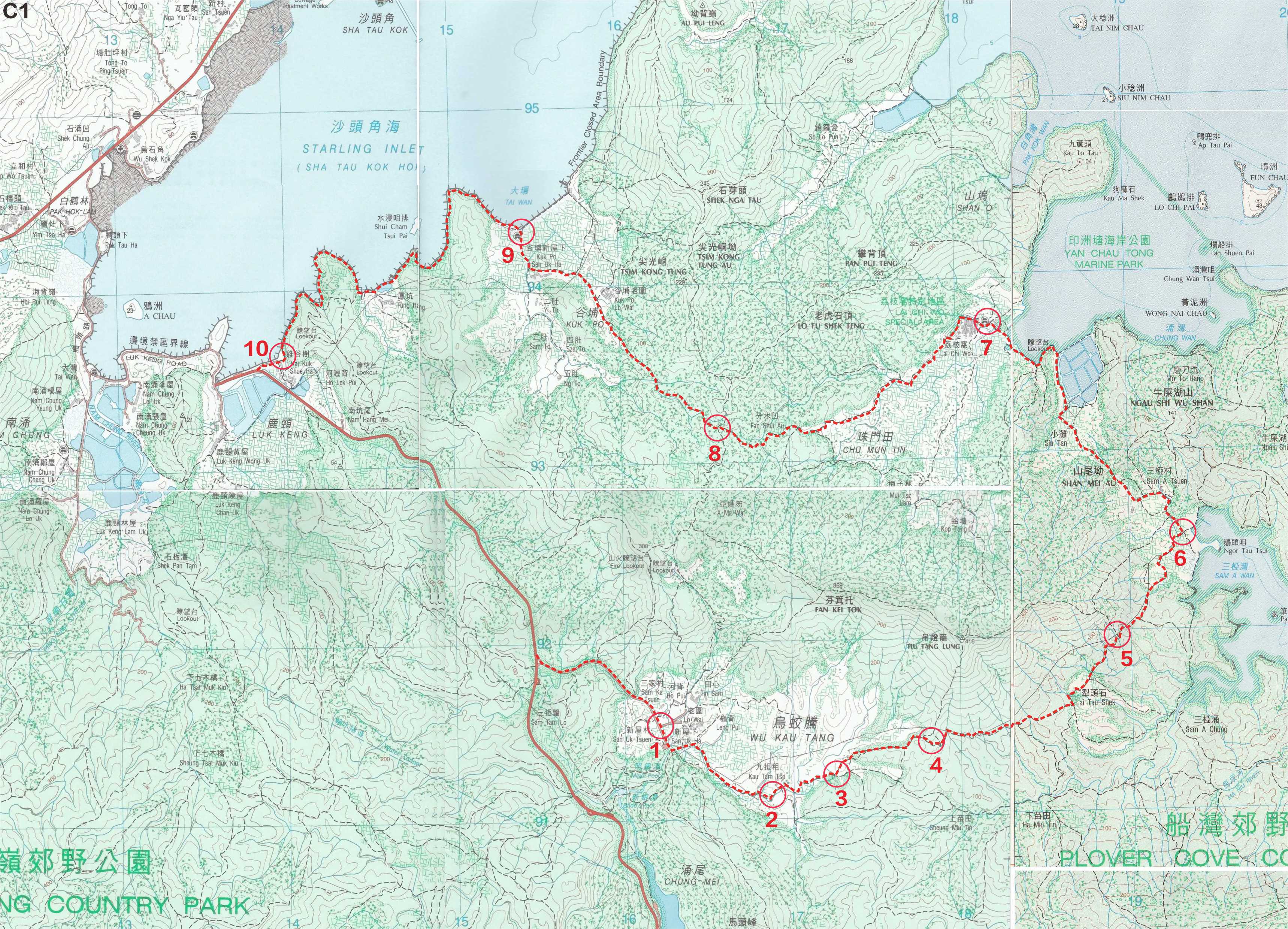 由烏蛟騰沿犁頭石古道到荔枝窩,遊古廟,細味客家村莊文化,尋老榕樹、千呎藤蔓、通心樹、紅樹林及銀葉樹的板根。在遊覽印洲塘海岸公園後,再經分水凹探尋古碑,沿谷埔出雞谷樹下。路程頗長,沿途有上下坡段,中途並無其他路徑離開。 |