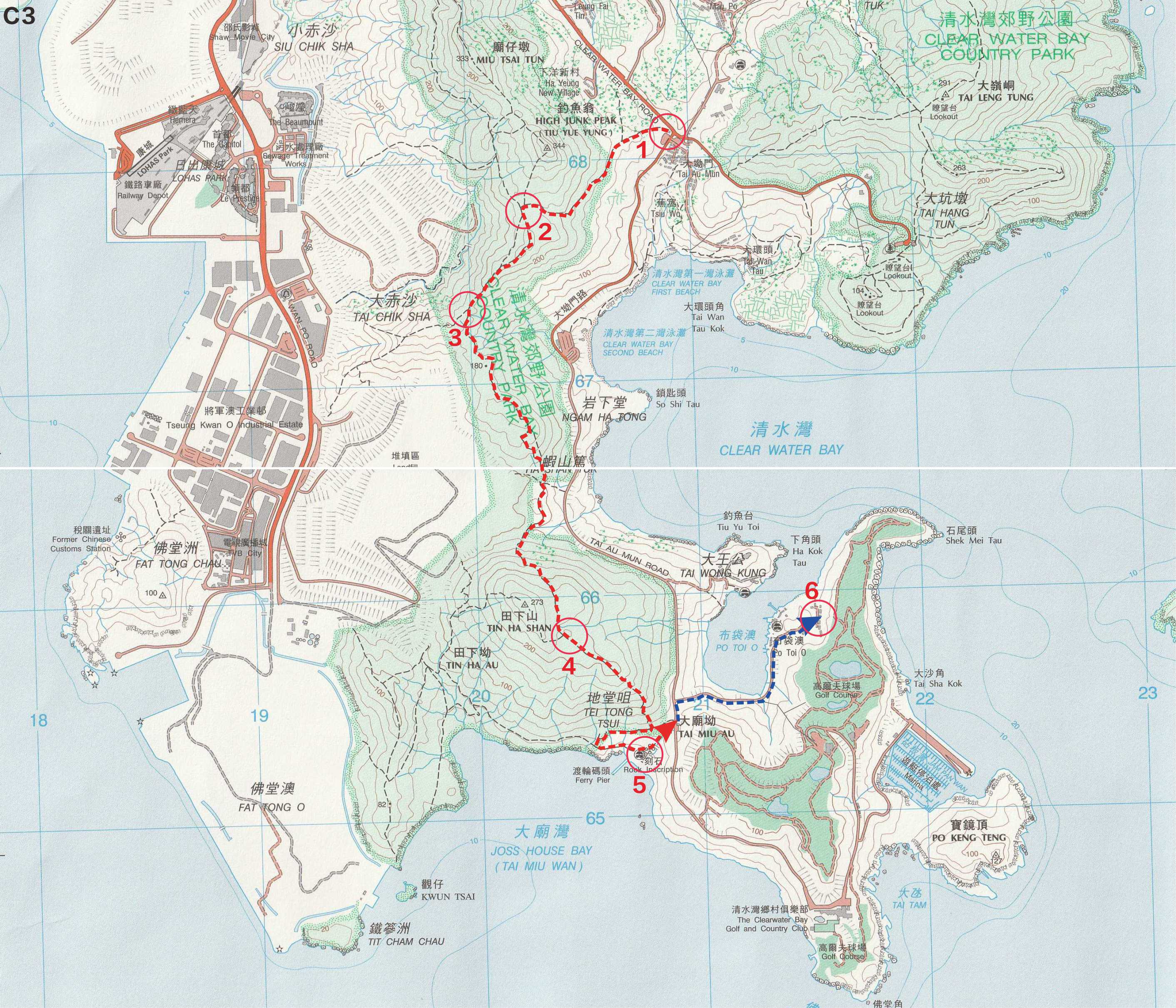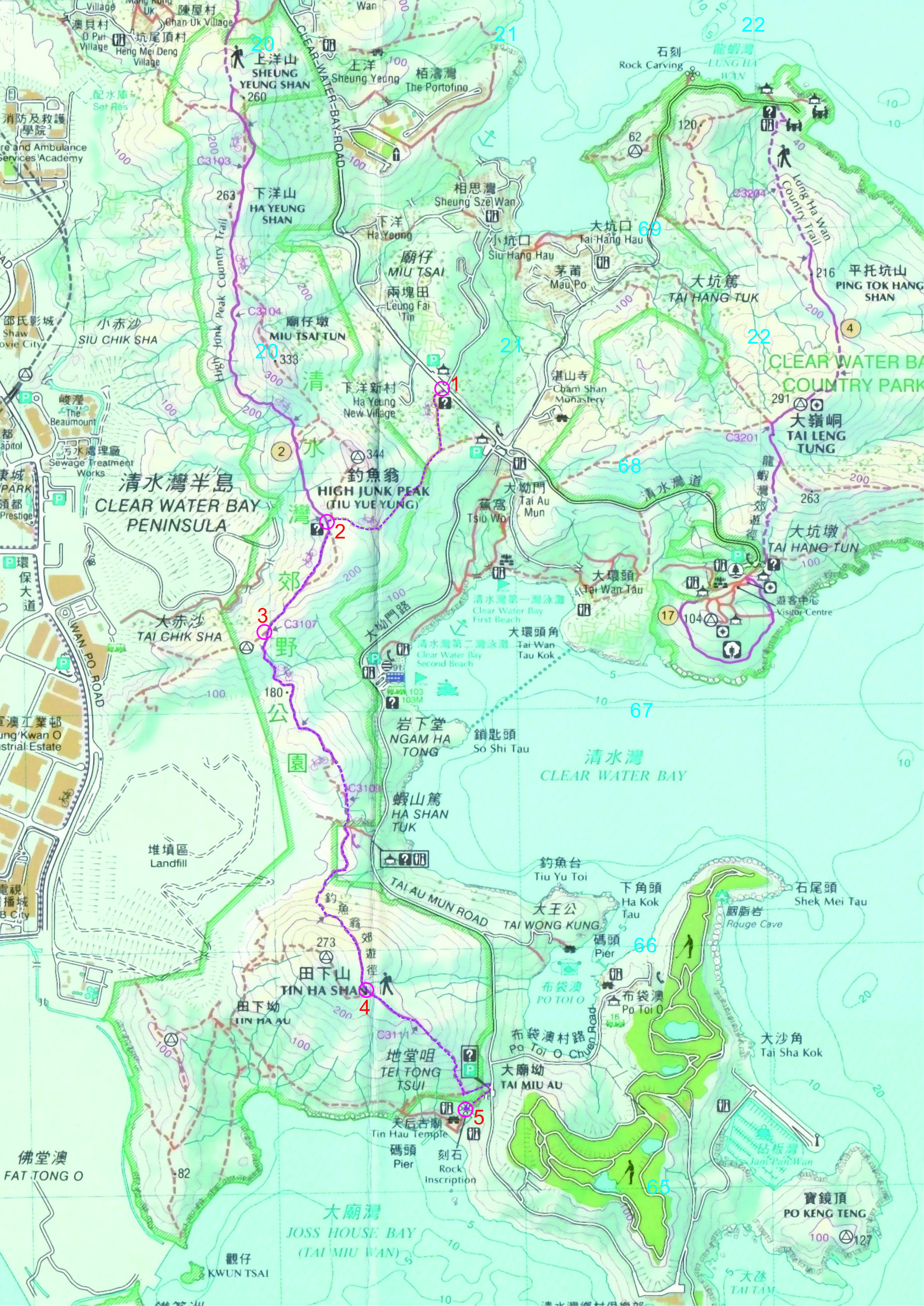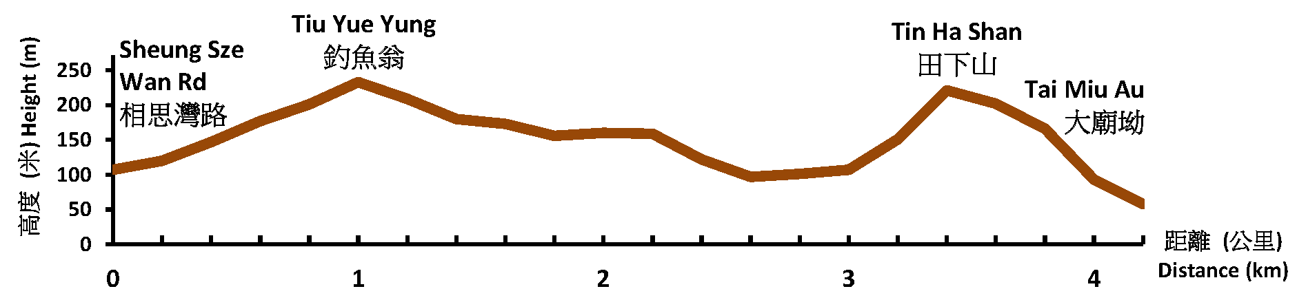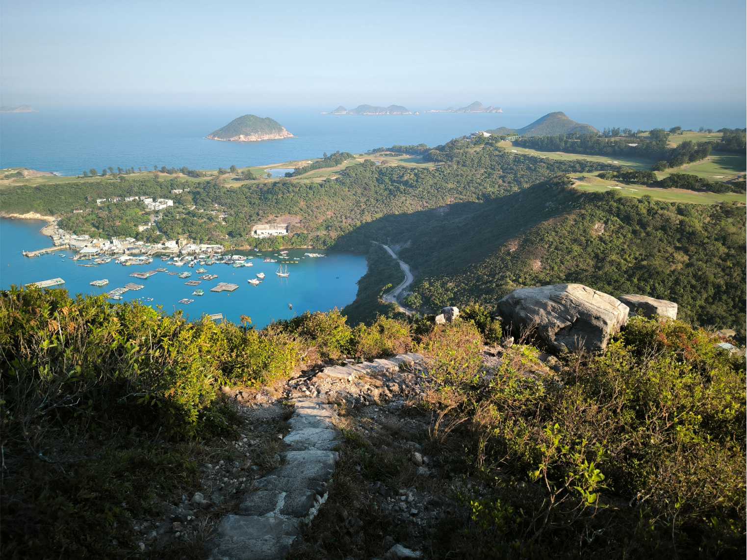 沿大坳門緩登釣魚翁,再沿郊遊徑攀海拔273米的田下山,細賞佛堂門地勢和東龍島古蹟地貌,再觀「大廟」及「大廟灣刻石」。沿途有上下坡段,釣魚翁郊遊徑頗為崎嶇。 |