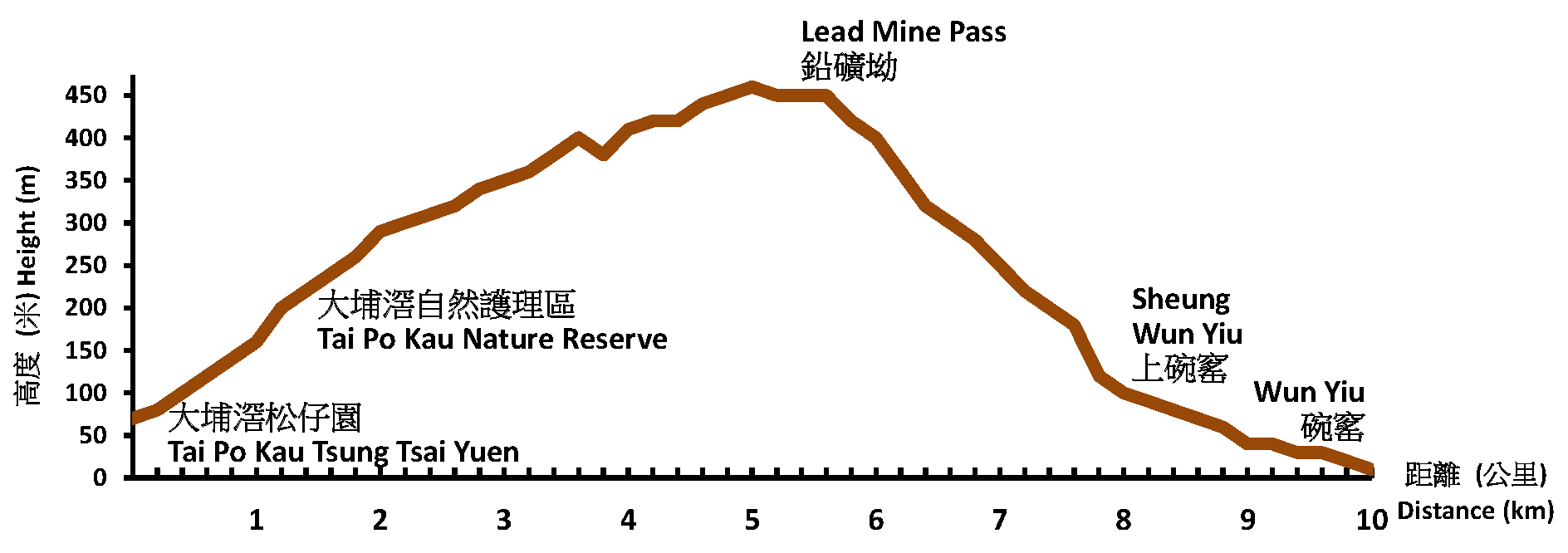 由松仔園經大埔滘自然護理區抵鉛鑛坳,再沿清幽山徑直下碗窰,參觀歷史古蹟-樊仙宮。路程頗長,大部分為車路, 易行,但限制的士及私家車駛入。 |