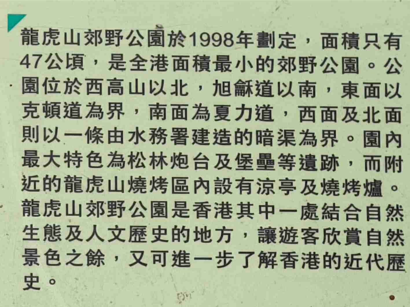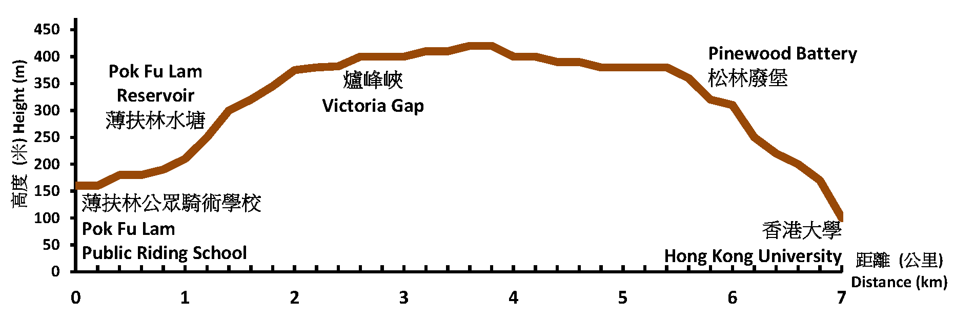 沿薄扶林水塘道逆走爐峰自然步道(爐峰是太平山的別名),在爐峰峽沿盧吉道直入環山道,可俯瞰維港景色。若沿夏力道順走環山道,有壯麗的飛瀑,路盡處為小花園。沿克頓道而下,見山丘松林廢堡,逾百年的松林炮台,戰爭的痕跡至今猶在。港島徑是尋界石、訪學府,以及研究港島歷史地理及自然景物的好地方。 |