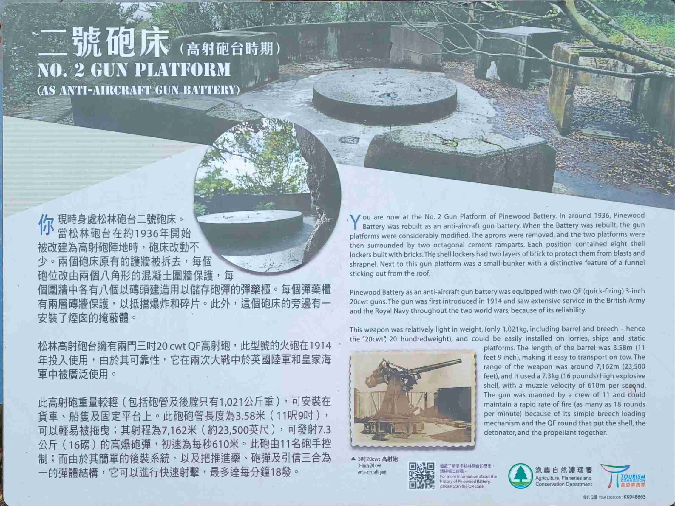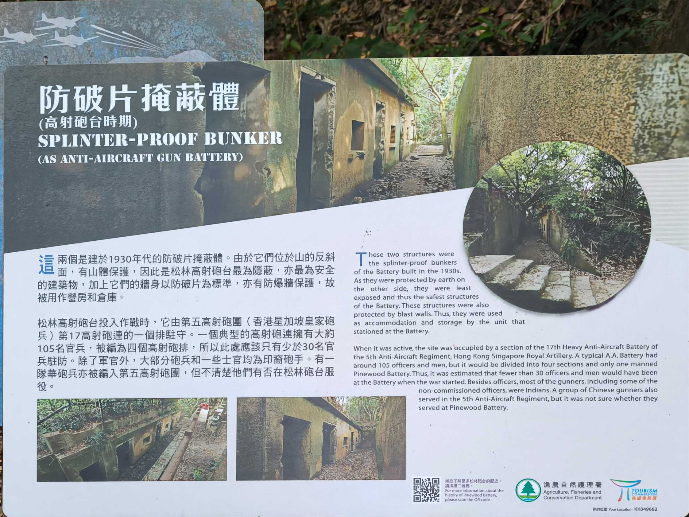松林砲台建於19世紀末至20世紀初,屬於英軍在港島山頂防禦系統的一部分,用以防禦可能由海上或維港方向的威脅。雖已廢棄,但遺址仍保留戰爭痕跡,石牆、基座等結構依稀可見,成為研究香港軍事史的重要見證。