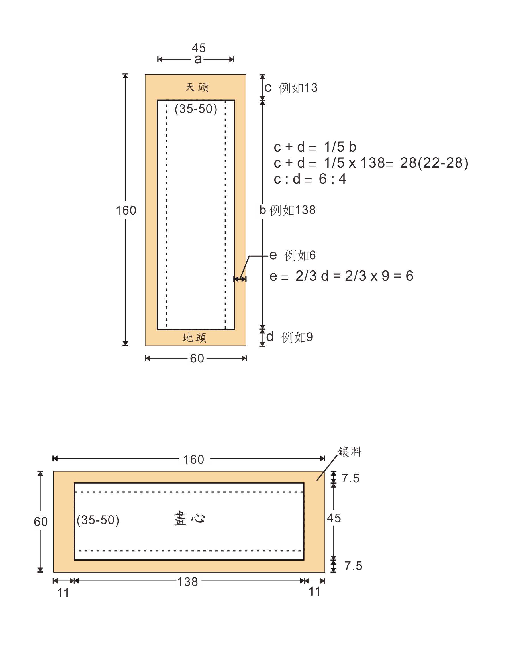 兩側約為地頭的2/3,天地頭為六四比,天加地頭的總長度約為作品高度的1/5。圖中單位為cm。